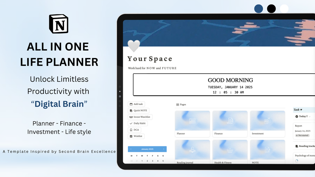 Elevate your productivity and clarity with Digital Brain, the ultimate life management tool designed to bring order to your thoughts, plans, and goals. Inspired by the concept of a second brain, this Notion planner transforms your ideas into actionable results—all in a calming blue-toned interface that sparks focus and creativity.