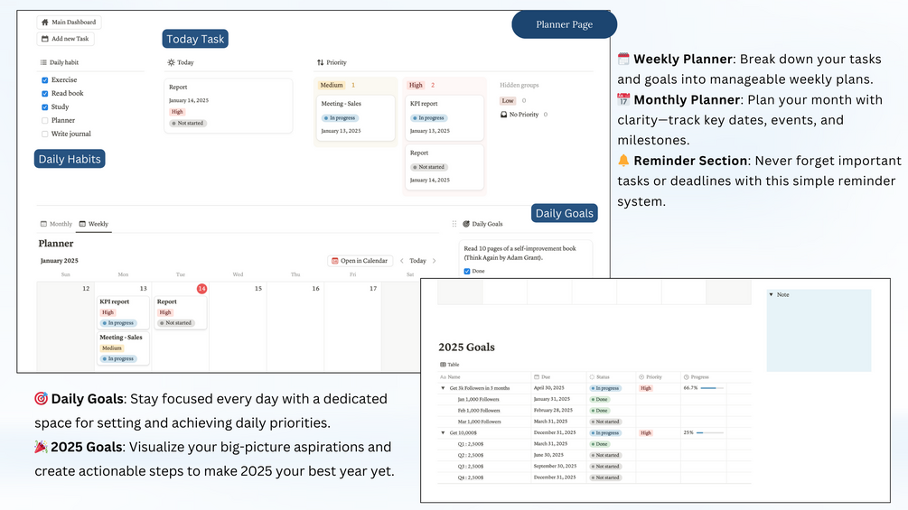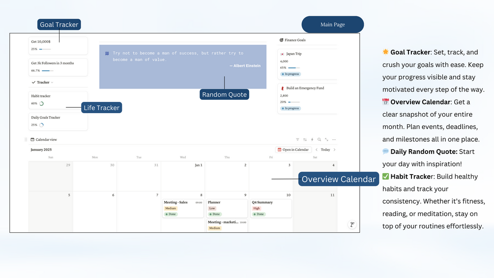 Elevate your productivity and clarity with Digital Brain, the ultimate life management tool designed to bring order to your thoughts, plans, and goals. Inspired by the concept of a second brain, this Notion planner transforms your ideas into actionable results—all in a calming blue-toned interface that sparks focus and creativity.