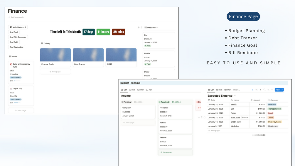 📅 Overview Calendar: A clear view of your month for effortless planning.